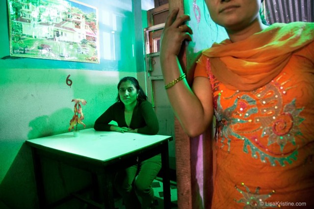 Lisa Kristine photographed the women in Kathmandu, Nepal. They work in “cabin restaurants,” euphemism for forced prostitution. Sexual slaves – women, along with young girls and boys, some as young as seven years old – are forced to provide clients with sexual entertainment, while encouraging them to buy more food and alcohol.